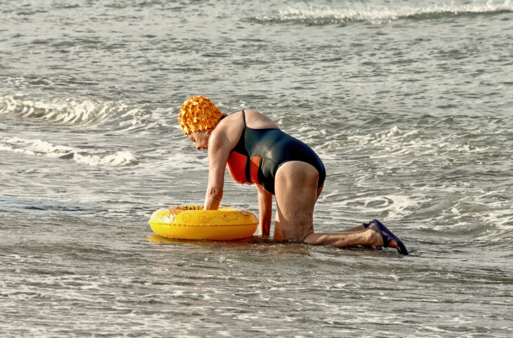I am pretty sure not being the only one whose heart melts down every time when looking at this photograph. It really speaks volumes! It is all about enjoying a summer day at the beach, apparently, but having as the main character an old lady, someone who is rather in the autumn season of her life. That's the age when all the basic things seemingly become a little more difficult, despite all the goodwill and enthusiasm.