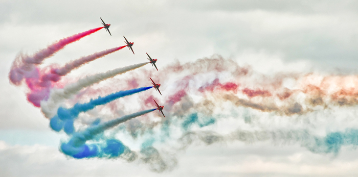 For capturing those split second parts of the routine like 2 jets crossing in opposite directions, don’t be afraid to use a continuous high-speed shutter release, panning one aircraft and starting the sequence using the ‘corner of the eye’ technique as the other approaches. But there’s still a lot of luck involved as even with 1/8s between frames, that’s a lot of aircraft movement at a closing speeds of 1000mph!