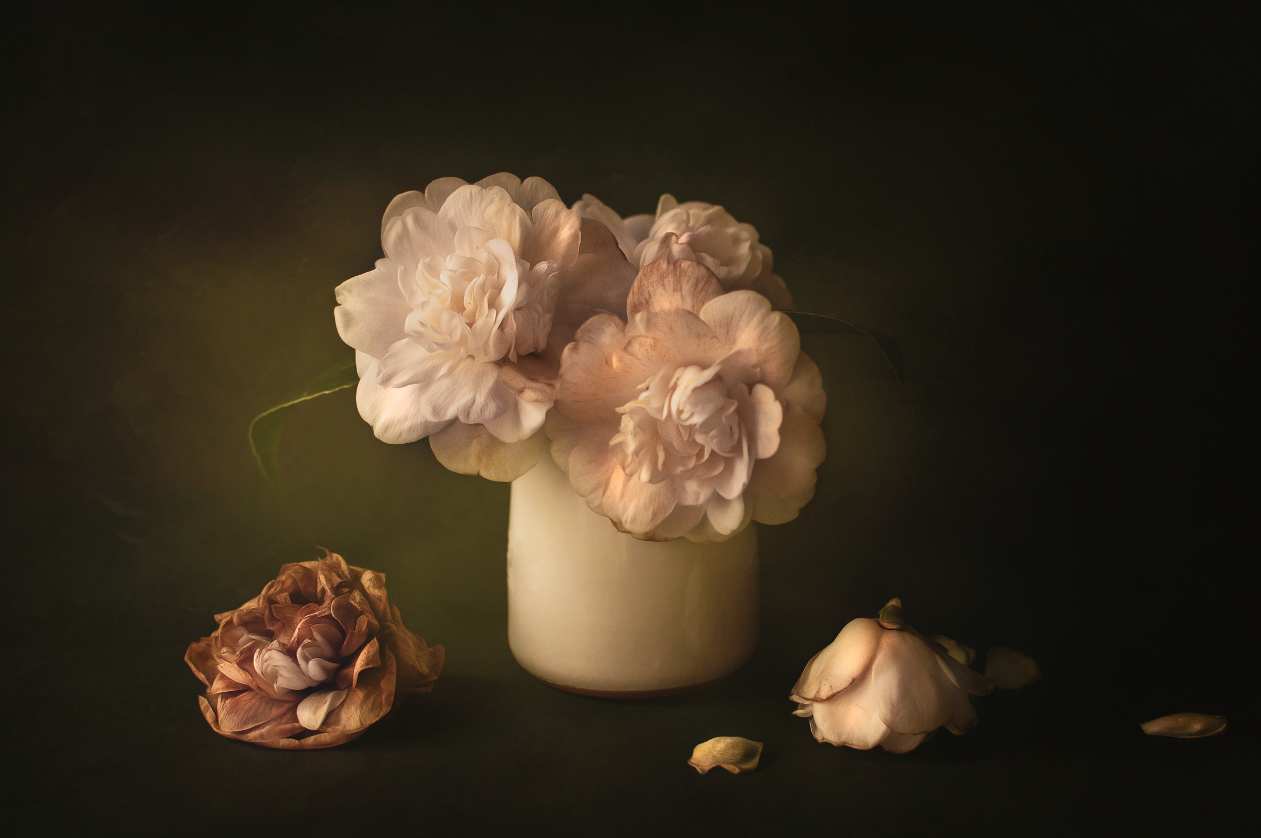 I shoot in manual mode. I transfer the raw files from the memory card into the computer and edit them in Lightroom. Then I select those images that serve my purpose, for example a floral composition. I open them in Photoshop and go from there. I can work for hours without feeling time go by. Many times I work on something and the result is not what I expected. Other times I get it right so I open the image in full screen and scan every little part of it, checking for flaws. Then I print it on A3 paper and examine it with a magnifying glass and from a distance.