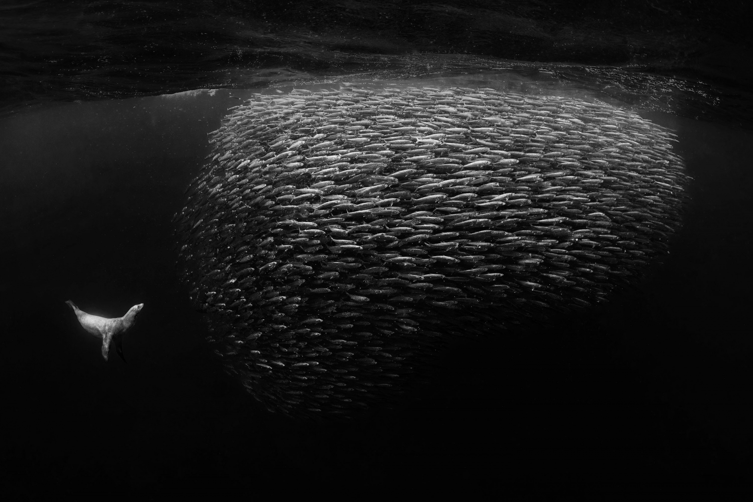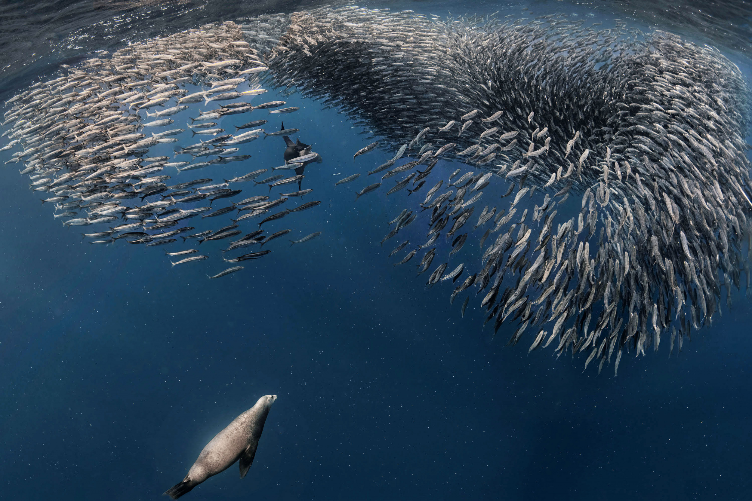 When our dive guide, Dana, spotted a nice-sized bait ball, she woke me up and asked if I wanted to try to get into the water. Despite feeling dehydrated, I did not want to miss the opportunity, so I drank some water and gathered my camera, went into the water, and shot non-stop for the next two hours. Multiple predators, including marlin, sea lions, tuna, and mahi-mahi, were trying to hunt down one bait ball, making everything happen very quickly. I was worried that my camera battery might not last, but I sensed I had captured some spectacular moments. I did not see the photos until later when I loaded them onto my computer. Despite feeling unwell, I was glad I pushed through and persevered to capture these incredible moments.