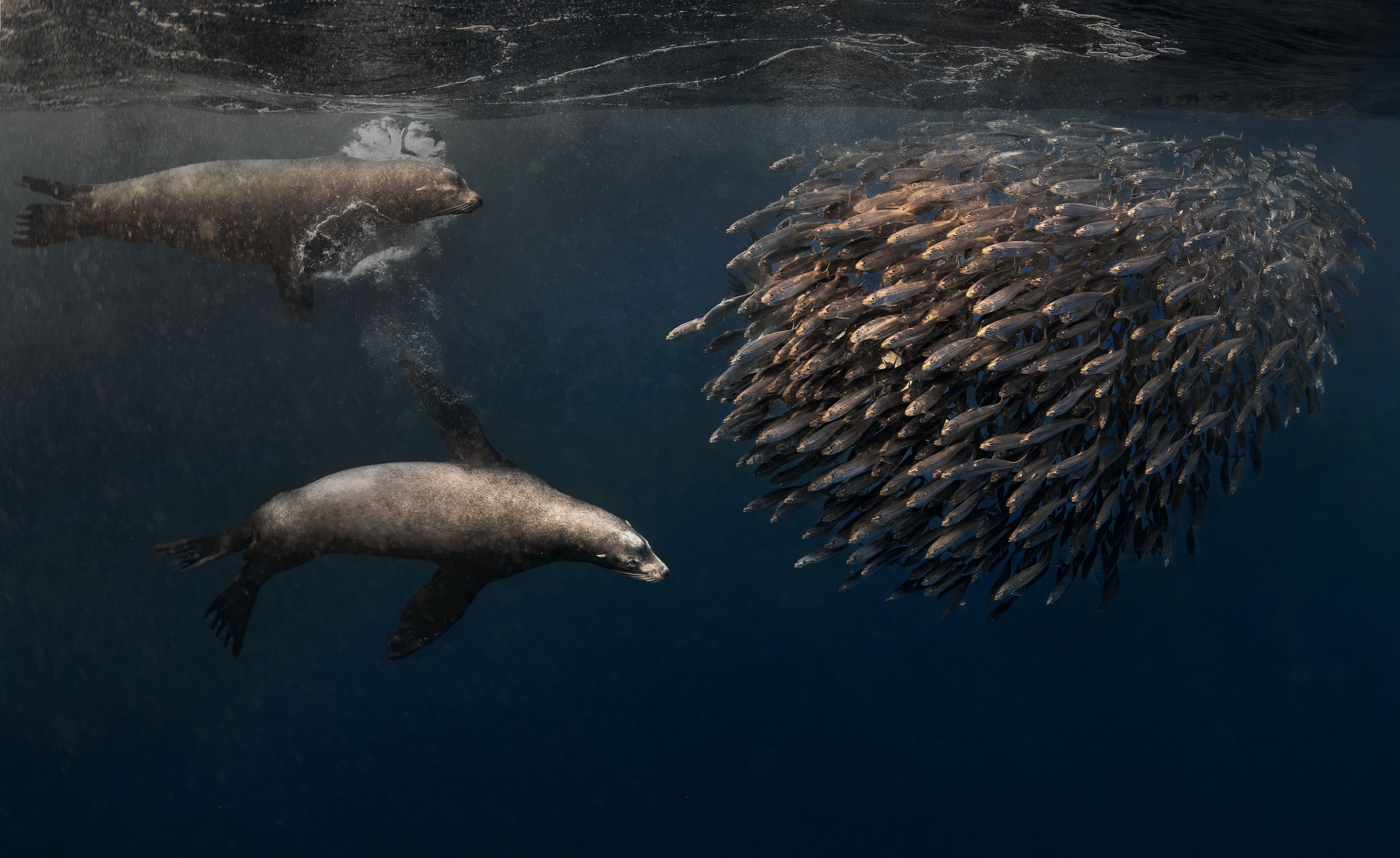 That kind of activity can sometimes be dangerous because the speed of marlin hunting is 60 miles an hour. The bait ball runs towards us when they are hunted because they want us to be their WALL to block their predators. We have to get away from them quickly, but many people have still been hurt by the sharp mouth of marlins. Actually, I myself was twice in danger on that trip. When several predators hunt a ball of bait, they do not fight, but sometimes hunt in turn. When a sea lion, looking at a ball of bait, gets ready to charge, you don’t want to be in their way.