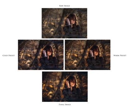 RAW image, Cold preset, Warm preset and final image