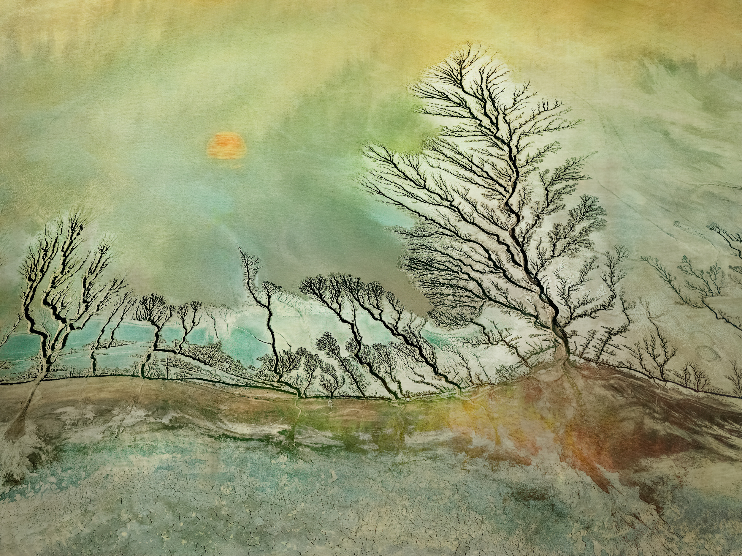 From "the traces", "boat ramp" or "sleeping beauties" to "dry river scape" or "ancient battle field" there is a very important creative gap in your work. Why and how did your photographs evolve from the figurative landscapes of your early days (often aerial) to these beautiful, more abstract paintings?